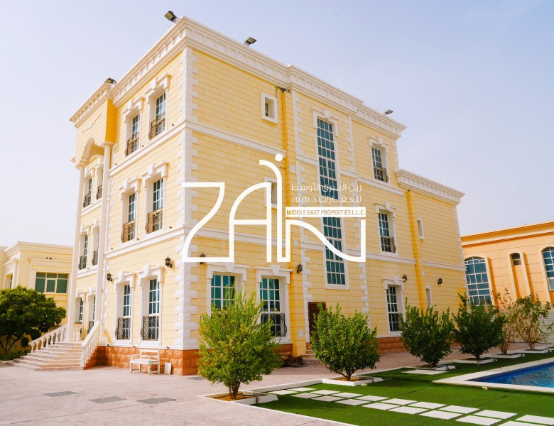 Book your viewing today with Zain Middle East Properties. Modern and well-maintained three-story 9-bedroom master villa with staff rooms and private large pool for sale in Shakhbout City.